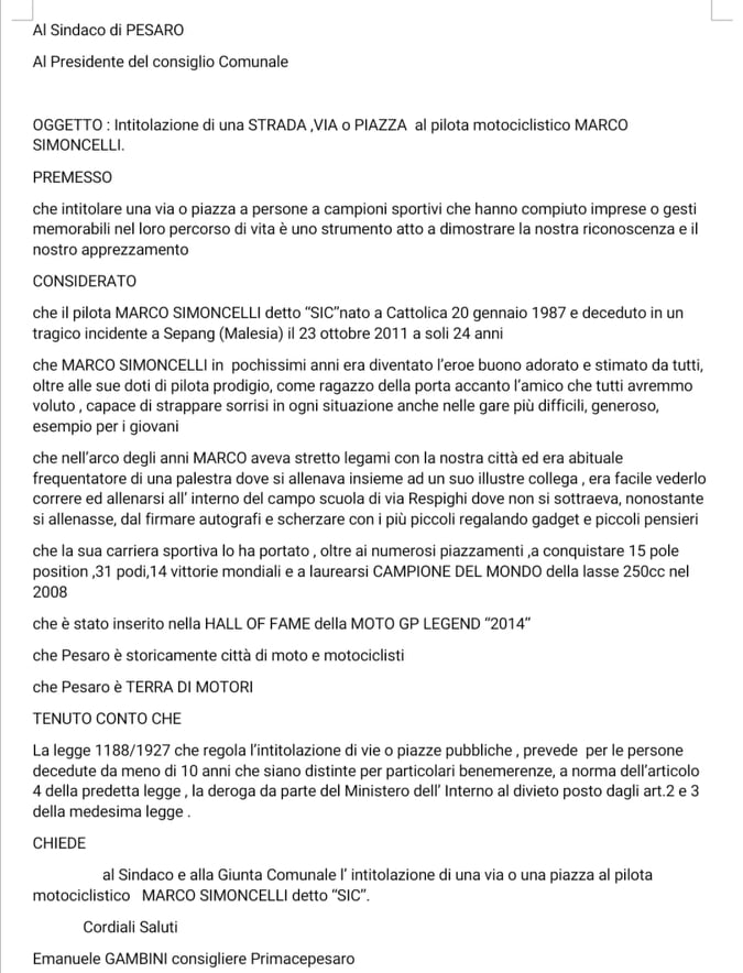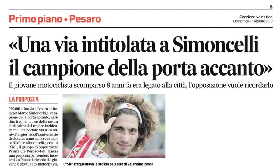 Adesso grazie ad una persona pulita come Simoncelli, che del suo sogno ha fatto una ragione di vita purtroppo stroncata troppo in fretta e grazie ad un altro sportivo pesarese, Emanuele Gambini, il sorriso e l’insegnamento del “Sic” resteranno per sempre impressi nella nostra città.