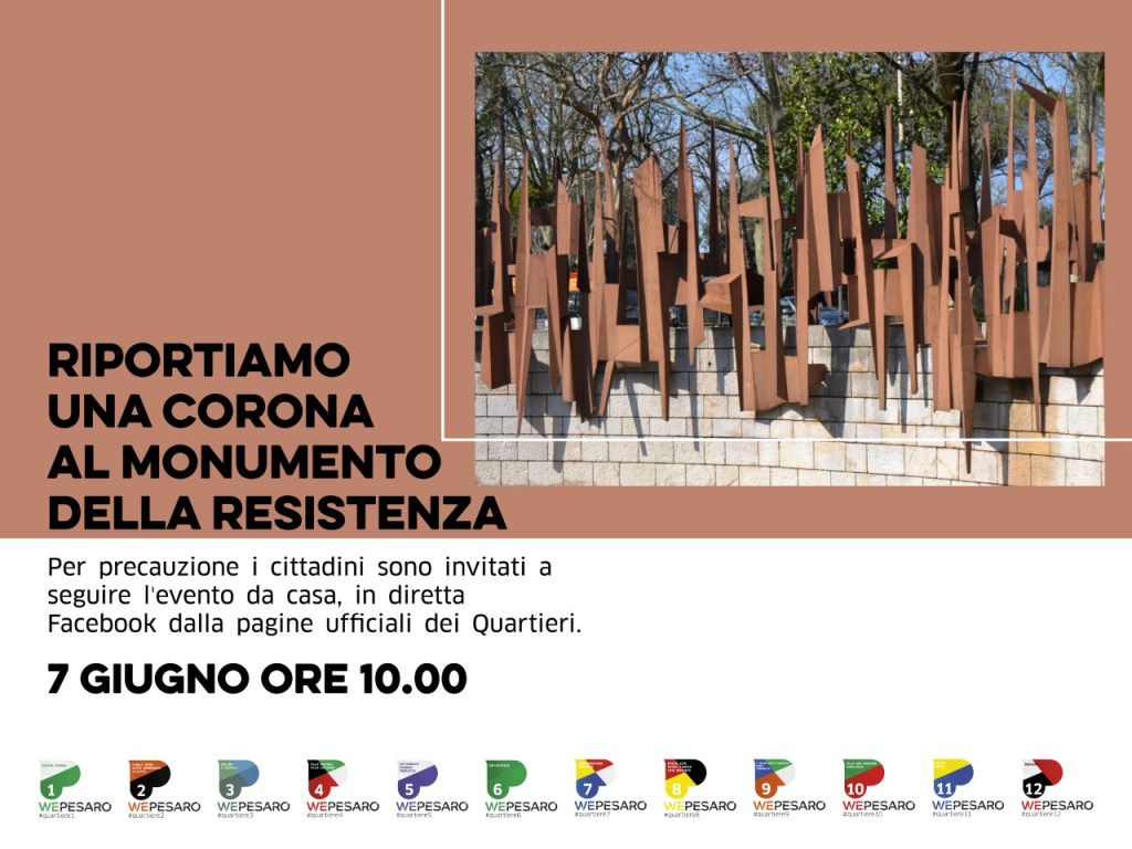 Dopo l’atto vandalico dello scorso 2 giugno, domenica 7 alle ore 10, sarà deposta una nuova corona in memoria dei caduti al monumento della Resistenza. L’iniziativa è stata voluta dai presidenti di quartiere: “Nel giorno della Festa della Repubblica, purtroppo, qualcuno ha offeso la memoria di tutti distruggendo la corona posta al Monumento della Resistenza in occasione del 25 Aprile scorso. Come Presidenti dei Quartieri della città – spiega Luca Storoni – , che ogni giorno vivono tra i pesaresi e prestano volontariamente parte del loro tempo alla propria realtà locale, ci ha ferito vedere che in un momento difficile e doloroso come quello che stiamo affrontando a causa del Covid-19, ci sia chi all’unità e alla voglia di ricostruire insieme, contrappone la stupidità e l’ignoranza distruggendo e umiliando i simboli di una comunità, di una città, di una nazione, il ricordo e lo spirito di generazioni che hanno sofferto e sono morte per costruire quello che oggi siamo, una libera Repubblica Democratica”.