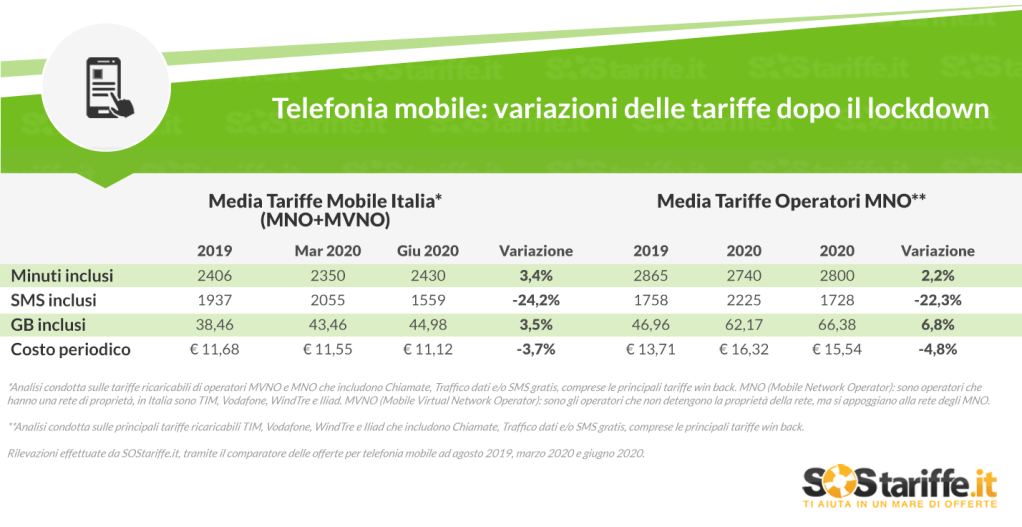 La comparazione effettuata da SOStariffe.it ha preso in considerazione i prezzi delle offerte per la telefonia mobile relativi ai mesi di agosto 2019, marzo 2020 e giugno 2020. Nello specifico sono stati analizzate sia le tariffe degli operatori MNO, Mobile Network Operator, sia quelle dei MVNO, Mobile Virtual Network Operator.