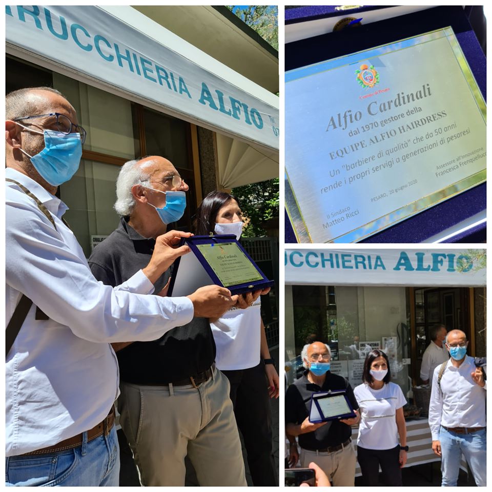 PESARO – Targa consegnata dal sindaco Matteo Ricci ad Alfio Cardinali, «barbiere e parrucchiere storico», per i 50 anni di attività a Pesaro. «Da dieci lustri Cardinali contribuisce a tramandare professionalità, abilità e sapienza per questo mestiere. Una passione che si combina con un altro grande amore, quello per i colori biancorossi della Vis. Grazie Alfio da parte di tutta la città», evidenzia il sindaco, affiancato dall’assessore Mila Della Dora.