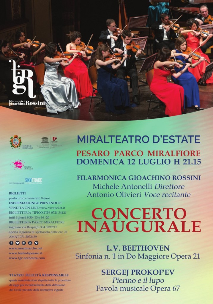 Domenica 12 luglio 2020 alle ore 21.15 parte la rassegna Miralteatro d’Estate, organizzata dal Comune di Pesaro in collaborazione con AMAT nello spazio dell’anfiteatro del Parco Miralfiore. Il programma si apre con un concerto della Filarmonica Gioachino Rossini, diretta dal M° Michele Antonelli. Il concerto è suddiviso in due sezioni, con la prima che vedrà l’esecuzione della Sinfonia n. 1 in do maggiore Op.21 di Ludwig van Beethoven, nei movimenti Adagio molto, Allegro con brio – Andante cantabile con moto – Minuetto – Adagio, Allegro molto e vivace. Composta tra il 1799 e il 1800 quando Beethoven era ormai sulla soglia dei trent’anni, la Sinfonia mostra ancora richiami ai lavori di Haydn e Mozart, ma evidenzia la personalità di un giovane Beethoven che, pur rendendo il dovuto omaggio ai predecessori, è in grado di dimostrare tutto il suo talento. La sinfonia è stata scelta per celebrare i 250 anni dalla nascita di Beethoven, il genio musicale che seppe comporre pagine musicali immortali.