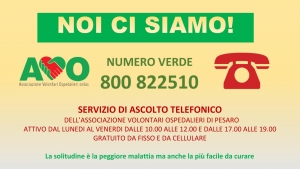 PESARO – “Noi ci siamo!”. Si chiama così il nuovo servizio di ascolto telefonico promosso dall’Avo Pesaro (Associazione volontari ospedalieri) per offrire un sollievo alla solitudine e allo sconforto, non solo di chi si trova ricoverato in ospedale, ma anche di chi sente così a casa.