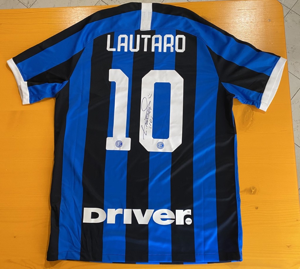 La maglia nerazzurra dell’Inter FC, ufficiale della stagione 2019/20, personalizzata con nome e numero di Lautaro Martínez. A rendere unico il cimelio, l’autografo dell’attaccante argentino (base d’asta € 250).
