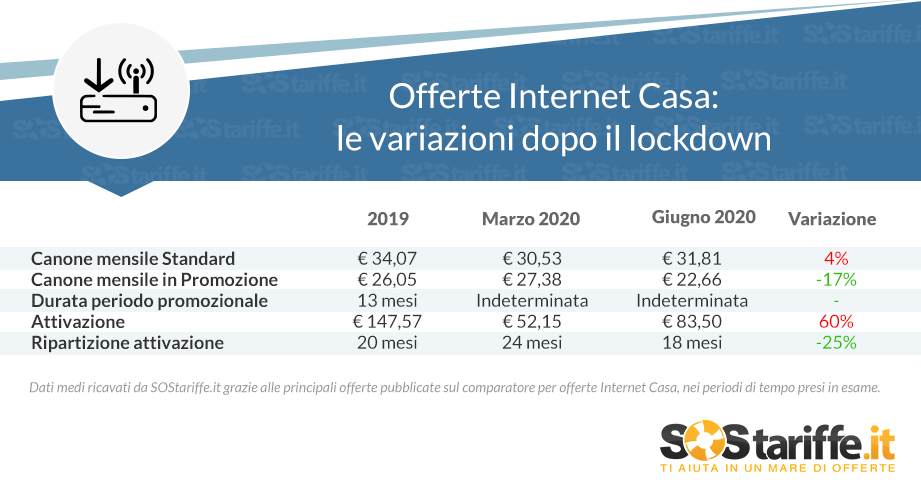 Le offerte internet per navigare da rete fissa restano allettanti all’indomani della fine del lockdown. La maggior parte dei pacchetti, infatti, richiede il pagamento di un canone promozionale ancora più economico e di durata illimitata. Si registra, tuttavia, un rincaro del costo di attivazione (+60%). L’ultimo osservatorio SOStariffe.it ripercorre l’evoluzione dei prezzi, esaminandone l’andamento tra la fine del 2019, il periodo di quarantena e i prezzi attuali delle principali offerte sul mercato