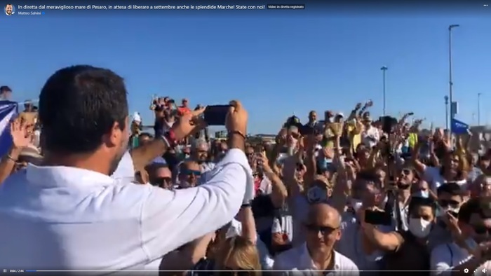 PESARO – “Il cambiamento è nelle mani vostre mani: quindi a settembre le Marche aspettano voi, abbiamo bisogno di donne e uomini liberi e orgogliosi”. Così il leader della Lega Matteo Salvini in diretta Facebook durante un incontro pubblico molto partecipato sul molo di Levante a Pesaro, a proposito delle prossime Regionali nelle Marche del 20-21 settembre. “In diretta dal meraviglioso mare di Pesaro – recita un post sul profilo Fb di Salvini – in attesa di liberare a settembre le splendide Marche”.
