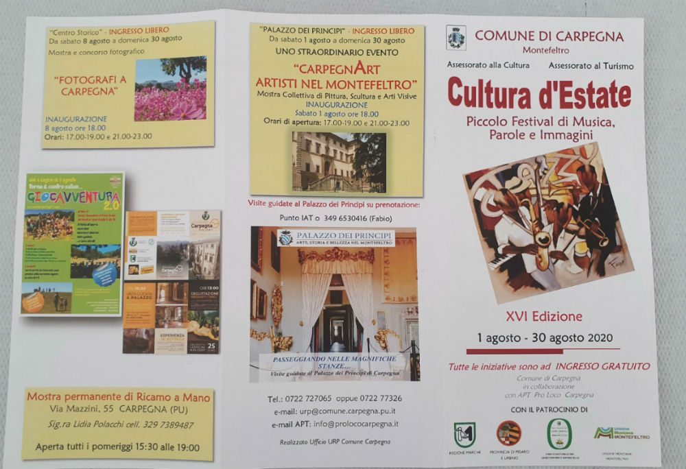 “Cultura d’Estate è il Festival culturale e musicale di Carpegna e del Montefeltro, sempre molto seguito ed apprezzato. Presentiamo con orgoglio un programma ricco, variegato e di qualità – sottolinea l’assessore alla Cultura e alle Politiche sociali e sanitarie, Luca Pasquini – . Concerti, conferenze, presentazioni di libri nei luoghi più caratteristici di Carpegna. Con artisti e personaggi del nostro territorio, la bravissima Lucia Ferrati, il professor Simone Paci, il giornalista Luciano Paci, lo storico del Montefeltro Vittorio Lombardi, lo scrittore Fabrizio Battistelli e tanti altri. Da De André al jazz manouche e alla poesia, da Raffaello a Tonino Guerra e Fellini, dall’esplorazione dei cieli in notturna alla visita guidata alla Pineta del Cippo, al rapporto storico tra Carpegna e il ciclismo. Si partirà con la grande mostra collettiva di pittura, scultura e arti visive di artisti di Carpegna e del Montefeltro , “ CarpegnArt. Artisti nel Montefeltro”, che si potrà ammirare all’interno del maestoso palazzo dei Principi di Carpegna”,dal 1° al 30 agosto 2020: vi esporranno oltre 40 artisti del Monfeltro, tra pittori scultori e fotografi ”. L’inagurazione è in programma per sabato 1° agosto alle 18 , quindi la mostra potrà essere visitata negli orari 17 – 19 e 21 – 23, fino a fine agosto, ad ingresso libero”.
