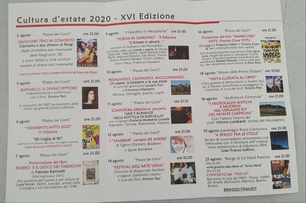 CARPEGNA – Conto alla rovescia per l’avvio di “Cultura d’estate 2020” : da sabato 1° agosto 2020 il “Piccolo festival di musica, parole e immagini” tornaad animare, per la XVI edizione, l’estate di Carpegna con un mese di concerti, spettacoli, cinema, presentazioni di libri, mostre, festival d’arte, video-conferenze e visite guidate, fino al 30 agosto 2020.