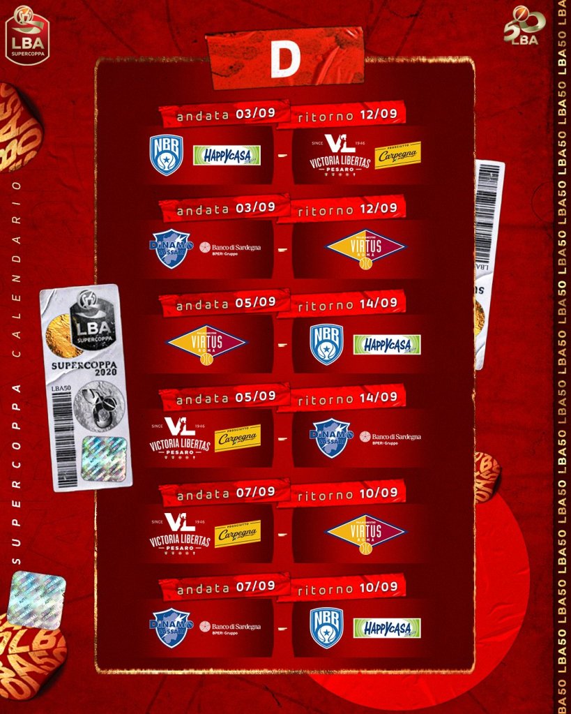 I biancorossi debutteranno giovedì 3 settembre contro i pugliesi per tornare in campo poi due giorni dopo per affrontare il Banco di Sardegna Sassari. Il girone di andata si chiuderà lunedì 7 settembre contro la Virtus Roma. Il girone di ritorno prenderà il via giovedì 10 settembre con il match che vedrà i biancorossi impegnati di nuovo contro i laziali. Due giorni dopo sarà la volta della sfida contro la Happy Casa Brindisi. Lunedì 14 settembre l’ultimo confronto, quello tra la Carpegna Prosciutto Basket Pesaro e il Banco di Sardegna Sassari.