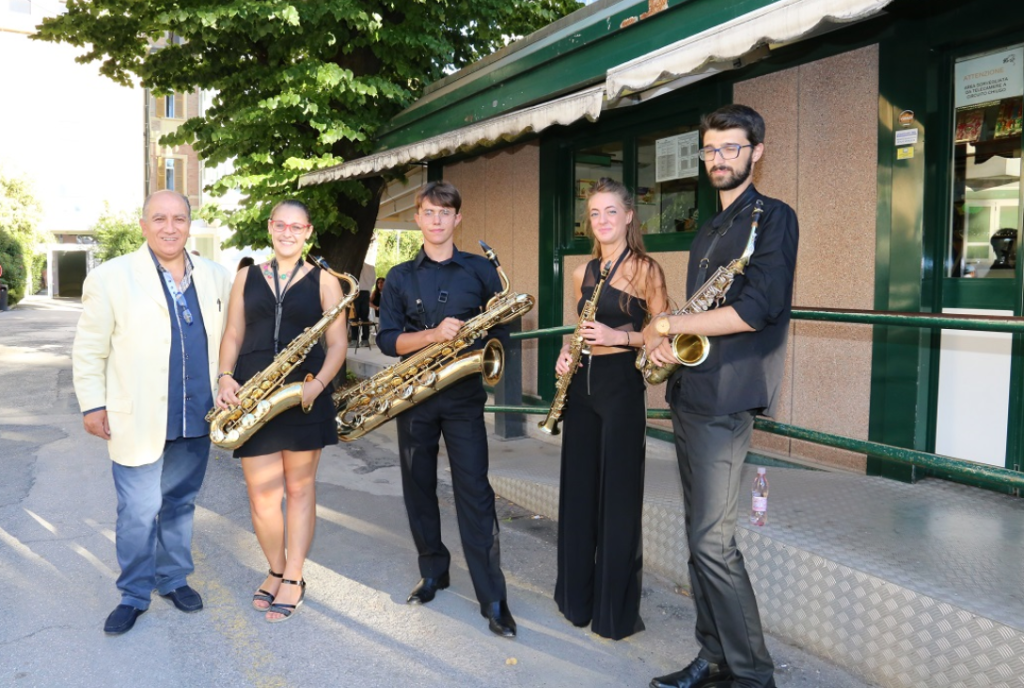 Foto 2. Il Maestro Stefano Venturi con i componenti del Quartetto di Sassofoni del Conservatorio Statale Rossini