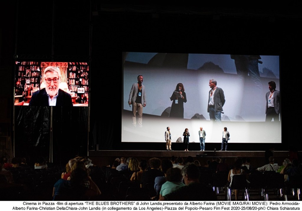 È stato un weekend speciale sotto tanti aspetti quello che ha aperto la 56° Mostra Internazionale del Nuovo Cinema e non solo per la situazione straordinaria nel quale si svolge la manifestazione. Protagonista assoluta delle giornate di sabato e domenica è stata Piazza del Popolo che ha ospitato due degli eventi più attesi dell’intero festival: il concerto Luccichini dappertutto e la proiezione del film d’apertura, la versione in 4k di The Blues Brothers, con un intervento di John Landis. Eventi che, nonostante la capienza ridotta dovuta alle norme di sicurezza, hanno fatto registrare comunque il tutto esaurito (sia in piazza che in spiaggia), facendo emergere una voglia di cinema e di musica sopita per mesi.