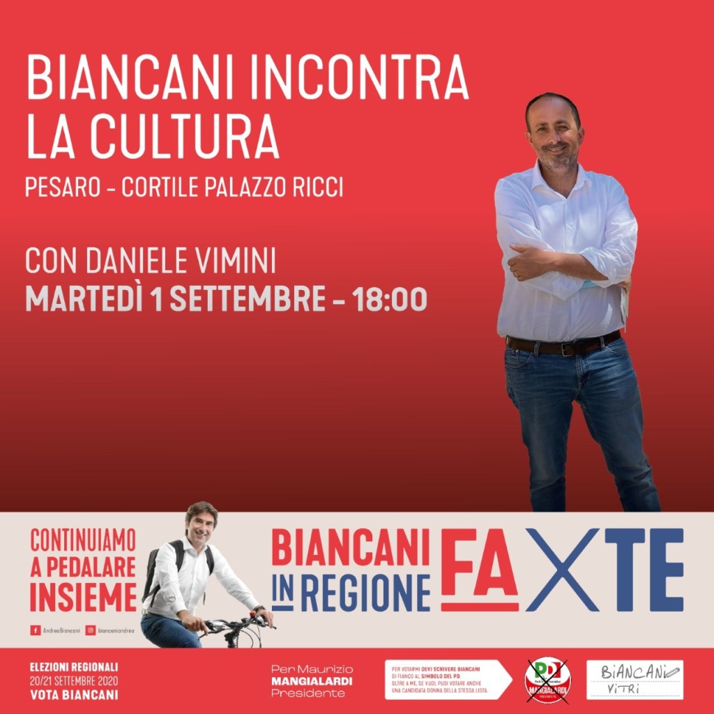 Si terrà domani, 1 settembre alle ore 18, nel giardino della musica Riz Ortolani, cortile di Palazzo Ricci, l’incontro tra il candidato Andrea Biancani e il mondo della cultura, coordinato dal vicesindaco e assessore alla Bellezza Daniele Vimini.