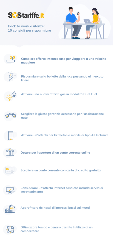 La stagione che comincia segna il ritorno al lavoro e tra i banchi di scuola. Ma il back to school (e work) potrebbe anche essere un’occasione ottima di risparmio per le famiglie. Dieci consigli degli esperti SOStariffe.it per scegliere le migliori offerte di luce, gas, telefono ma anche le polizze rc auto e i conti correnti più convenienti, con l’aiuto del comparatore.