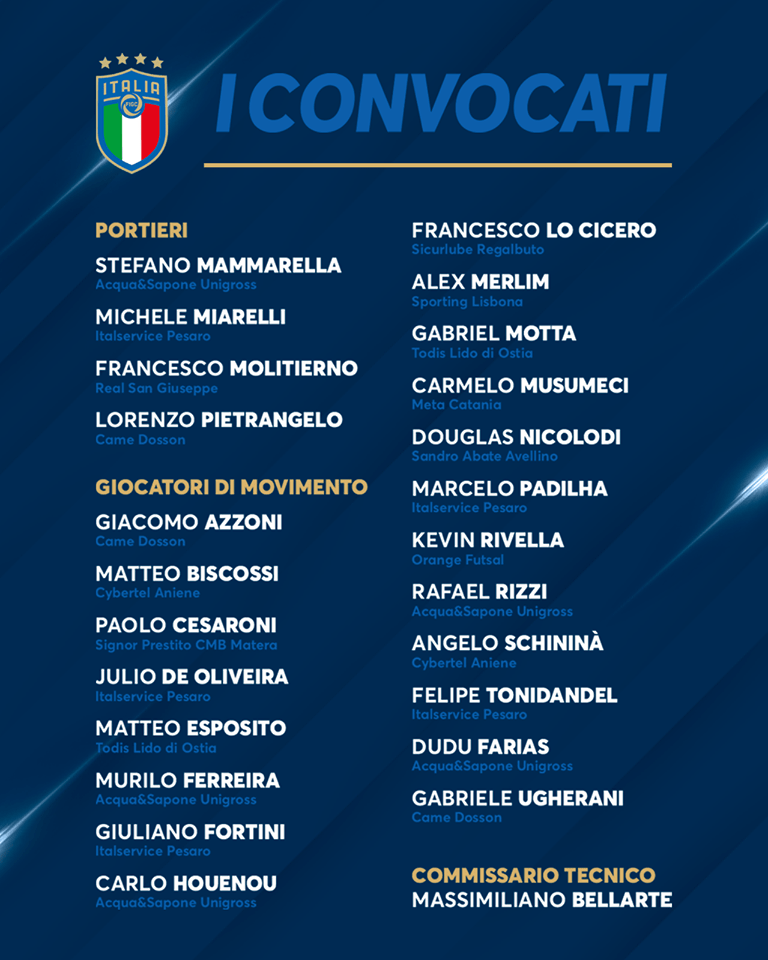 Sono sei le novità assolute nelle convocazioni del Ct: Matteo Esposito e Gabriel Motta del Lido di Ostia, Felipe Tonidandel del Pesaro, Alano Farias Eduardo (per tutti “Dudu”) e Rafinha Rizzi entrambi dell’Acqua&Sapone Unigross e il più giovane del gruppo, il classe 2001 Kevin Rivella dell’Orange Asti.
