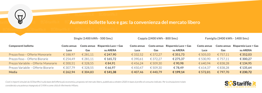I dati sono stati ricavati da SOStariffe.it avvalendosi del proprio comparatore offerte luce e gas. I costi e gli importi sono stati simulati sulla base della promozione più economica proposta sul mercato ad ottobre del 2020, in base a ciascun profilo di consumo. Poniamo, ad esempio, il caso di un single residente a Milano, con un fabbisogno elettrico di 1400 kWh e di gas di 500 Smc. Volendo passare al mercato libero può optare per una tariffa della luce a prezzo fisso. In questo caso spenderà in media per un’offerta monoraria circa 188 euro, che diventeranno 254 euro per una bioraria. In caso invece preferisca una tariffa a prezzo variabile, la somma che spenderà oscillerà tra i 300 e i 307 euro, a seconda che opti per la monoraria o la bioraria. Con una media annuale di circa 262 euro.