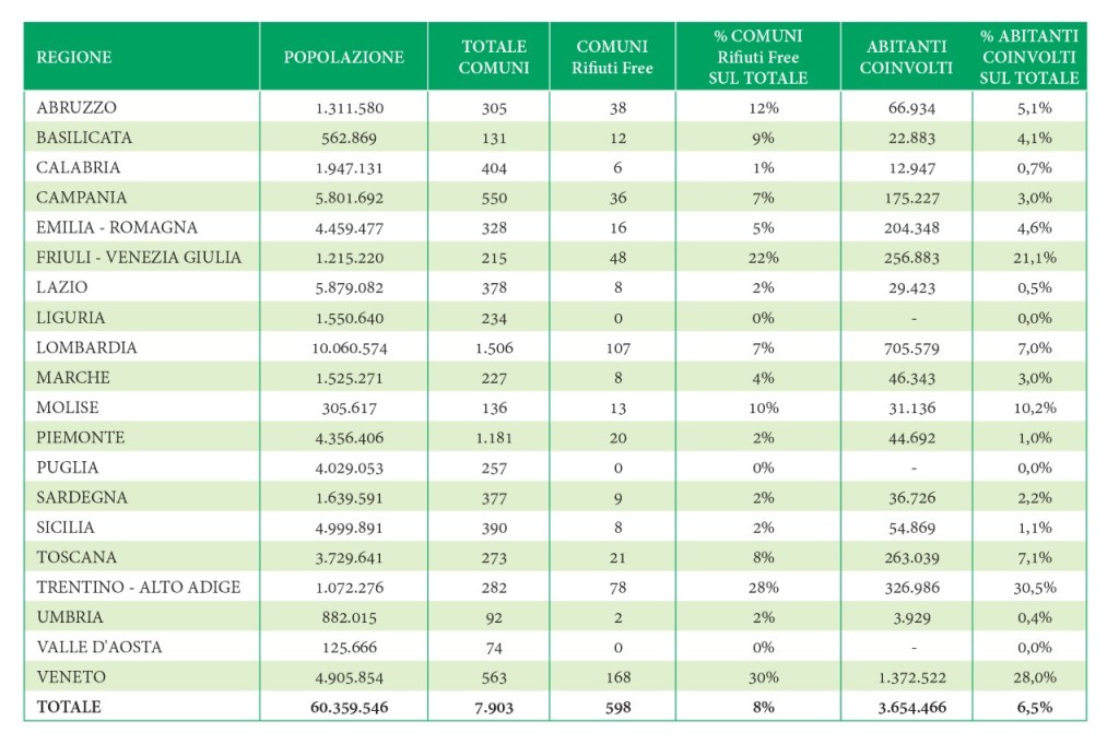 Nelle Marche, quindi, con 8 amministrazioni libere dai rifiuti, sono pronti alla sfida dell’economia circolare il 4% dei Comuni con il 3 % di popolazione coinvolta.