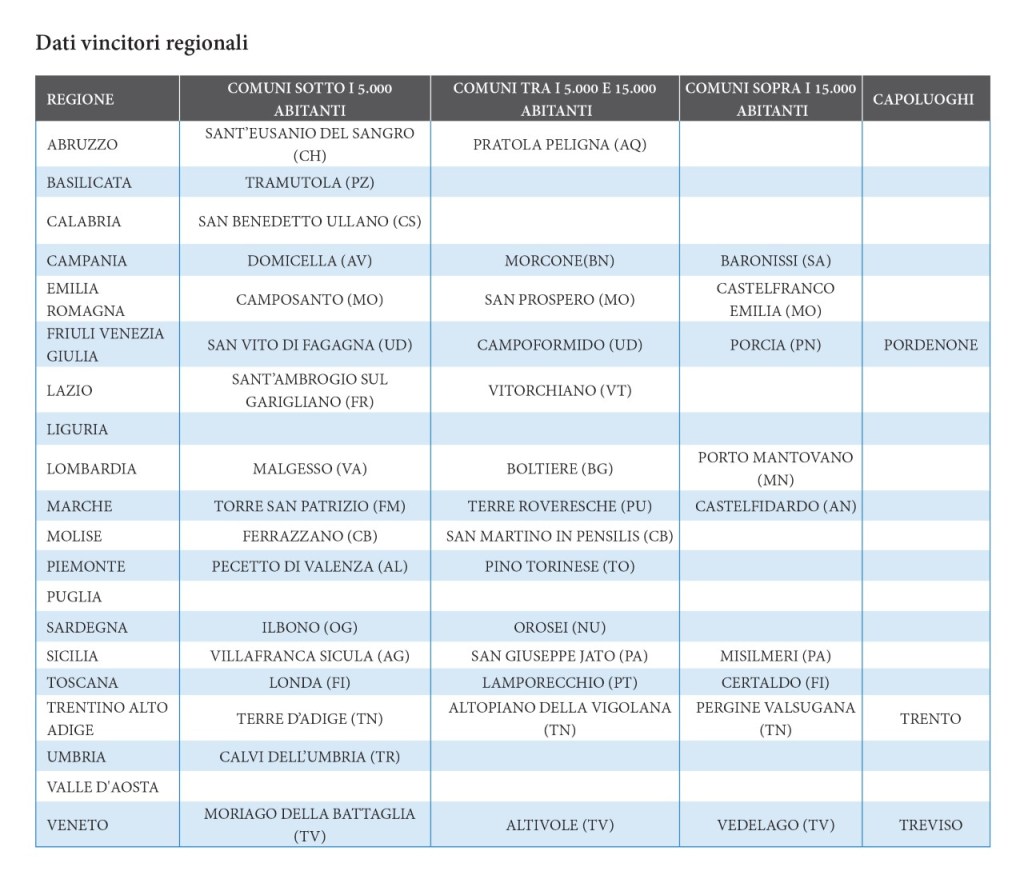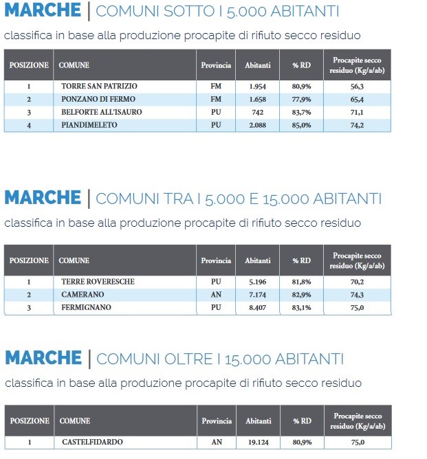 Vincitori assoluti sono il Comune di Torre San Patrizio (FM), con l’80,9% di raccolta differenziata e 56,3 kg/a/ab che si aggiudica la medaglia d’oro dei comuni al di sotto dei 5.000 abitanti. Segue Ponzano di Fermo (FM) con il 77,9% di raccolta differenziata e 65,4 kg/a/ab; Belforte all’Isauro (PU) con l’83,7% di raccolta differenziata e 71,1 kg/a/ab e Piandimeleto (PU) con l’85% di raccolta differenziata e 74,2 kg/a/ab.