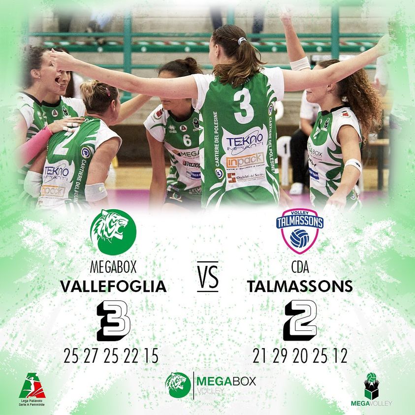 Vittoria di grande importanza per la Megabox Vallefoglia, giunta al termine di una maratona interminabile di cinque set combattutissimi sul campo della Cda Talmassons, squadra che al completo darà filo da torcere a tutti.