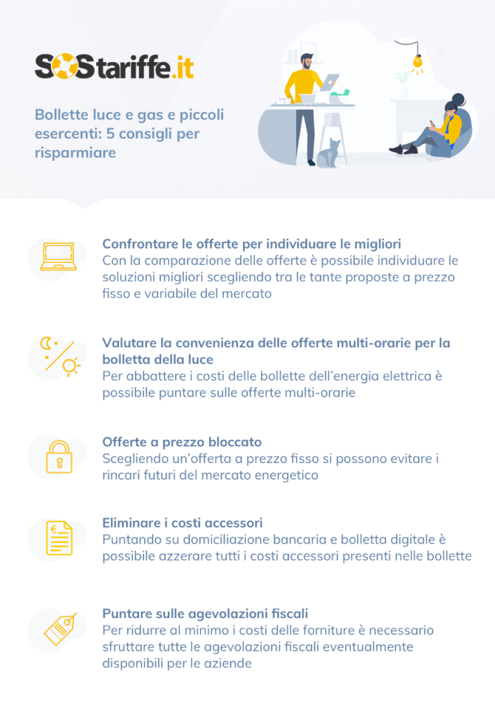 Per le piccole aziende può essere strategico riuscire ad alleggerire le fatture di luce e gas. Risparmiare sulle bollette energetiche è indispensabile, soprattutto per gli imprenditori in difficoltà economica o con liquidità limitata nel periodo della pandemia. Per farlo bisogna prendere in considerazione alcuni aspetti fondamentali. Come ad esempio la comparazione di più offerte per individuare le soluzioni migliori e orientarsi tra tariffe a prezzo fisso e a prezzo variabile. È importante, inoltre, conoscere i tipi di offerte business esistenti e avvalersi delle agevolazioni fiscali previste per le aziende. I trucchi degli esperti SOStariffe.it offrono un valido supporto per destreggiarsi nel mercato energetico con disinvoltura.