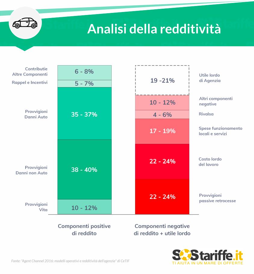Lo Studio realizzato da CeTIF e ANAPA va ad analizzare vari aspetti della redditività delle agenzie e dell’efficacia del loro modello operativo. In particolare, si evidenzia come la quasi totalità dei ricavi delle agenzie assicurative derivi dal comparto provigionale. Solo una minima parte (5-7%) è legato a Rappel e altri incentivi.