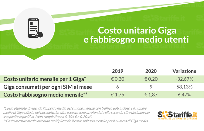 Il terzo parametro infine è il costo del fabbisogno medio mensile. Tale valore si è ottenuto moltiplicando il costo unitario mensile per i GB consumati in media ogni mese per ogni SIM, tenuto conto dei dati AGCOM. È venuto fuori così che nel 2019 il costo del fabbisogno si aggirava sui 1,75 euro ogni mese, quest’anno tale dato è salito a 1,87 euro (+6,47%).