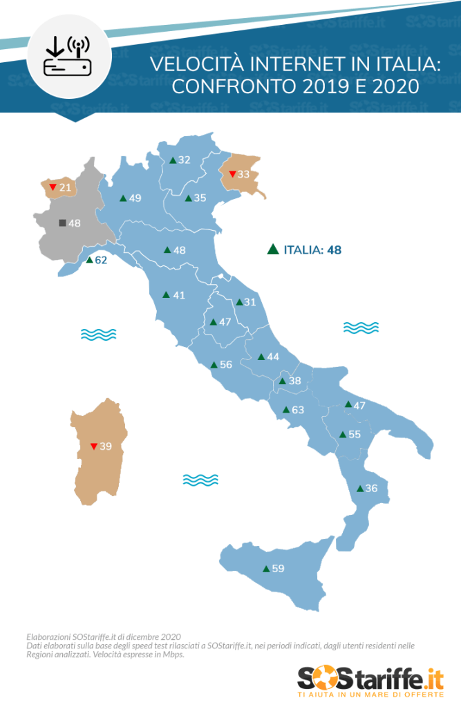 Nellaclassifica delle regioni italiane in ordine di rapidità di download, la Campania è sul podio (con 63 Mbit al secondo), mentre la Valle d’Aosta si aggiudica la maglia nera della connessione lumaca (21 Mbit/s). A stilare la graduatoria, confrontando le velocità di quest’anno con quelle del 2019, è l’ultimo Osservatorio SOStariffe.it. I dati rilevano un aumento della velocità download media in Italia del 25%. Nonostante la penisola non sia coperta per intero dalla tecnologia in fibra ottica, negli ultimi quattro anni le prestazioni delle offerte internet casa sono schizzate alle stelle. Sono sempre più infatti le linee con velocità pari o superiore a 30 mega in download. L’ultimo studio SOStariffe.it ha posto a confronto la velocità media di connessione dell’ultimo anno rispetto al 2019, tracciando la classifica delle regioni italiane in termini di rapidità della rete domestica. Velocità in aumento rispetto allo scorso anno ma non in tutte le regioni. La velocità media in download per la rete internet domestica in Italia nel 2020 è pari a 48 Mbit/s, mentre lo scorso anno si assestava su 38 Mbit/s. Un aumento del 25% che tuttavia non riguarda tutto il territorio. Alcune regioni, infatti, hanno subito maggiori incrementi rispetto a tutte le altre. È il caso, ad esempio, del Lazio (+59%), della Campania (+50%) e del Trentino-Alto Adige (+43%). Stesso discorso vale per la Basilicata (+41%), l’Abruzzo (+39%) e la Liguria (+36%). I dati della ricerca sono stati ricavati grazie agli utenti che hanno eseguito uno speed test per controllare la velocità della propria connessione, disponibile sul comparatore offerte internet casa SOStariffe.it. Alcune zone non fanno registrare variazioni nel corso del 2020: è il caso, ad esempio, del Piemonte. Qui la velocità della rete, nonostante il boom di accessi dovuto alla didattica a distanza e allo smart working, non ha subito alcuna variazione rispetto allo scorso anno. Purtroppo, le prestazioni hanno fatto un balzo indietro in alcuni territori. La velocità di connessione è peggiorata (lievemente) in Friuli-Venezia Giulia(è calata da 35 a 33 Mbit/s), in Valle d’Aosta (da 23 a 21 Mbit/s) e anche in Sardegna (dove è scesa da 42 a 39 Mbit/s).Banda ultra larga: un lusso ancora per pochi. La Valle d’Aosta fa passi indietro. L’analisi di SOStariffe.it ha stimato anche quanti utenti dispongano ad oggi di una connessione pari o superiore ai 100 Mega in download. Il confronto tra i dati del 2019 e del 2020 conferma una diffusione praticamente stabile di connessioni di questo tipo tra gli utenti di SOStariffe.it che hanno SOStariffe.it è il portale imparziale e gratuito che permette di confrontare tariffe e offerte delle principali utenze domestiche e servizi finanziari: ADSL, Telefonia, Internet, Pay Tv, Energia, Gas, Conti, Mutui, Finanziamenti e prodotti assicurativi. La tecnologia sviluppata garantisce all’utente un confronto personalizzato, accurato e basato sulle proprie esigenze.eseguito lo speed test (22% del totale). Il dato, tuttavia, presenta differenze sostanziali su base regionale. Nel corso del 2020, forse anche a causa dell’impulso dato dal lockdown, c’è stato un considerevole balzo in avanti della diffusione di connessioni da almeno 100 Mega tra gli utenti di SOStariffe.it in Molise (80% in più), Trentino-Alto Adige (+60%) e Veneto (+31%). Per assurdo, invece, alcuni territori fanno registrare addirittura un’inversione di tendenza con connessioni 100 Mega in calo in regioni come Liguria (-12%), Abruzzo (-13%), ma anche Calabria e Sicilia (-14%). Un peggioramento che si fa preoccupante in Puglia (-25%) ma soprattutto in Valle d’Aosta (-60%). Eppure, potrebbero usufruire del bonus previsto dal governo Conte per incentivare l’attivazione di una connessione in banda ultralarga. Dallo scorso 9 novembre i nuclei con Isee inferiore a 20mila euro possono ottenere il voucher di 500 euro utile anche per acquistare un pc o tablet, rivolgendosi a uno degli operatori accreditati. Il bonus serve a coprire i costi di un abbonamento da almeno 30 Mbps di velocità massima in download e il costo di un nuovo dispositivo per navigare. Connessione veloce: i fattori che incidono sulle prestazioni. Talvolta anche se disponiamo di un abbonamento per navigare ad alta velocità, ci possono essere una serie di fattori in grado di determinare un rallentamento della nostra connessione di casa. Cosa può incidere sulla sua velocità effettiva? Controlliamo ad esempio le applicazioni connesse in rete e sempre attive sul nostro dispositivo. Ma anche se per caso non sia in corso un aggiornamento automatico del pc. Se ancora non abbiamo risolto, la colpa potrebbe essere di una configurazione errata del pc. O ancora potrebbero esserci troppi utenti collegati nello stesso istante. O, infine, potrebbero essere gli agenti atmosferici a giocare a nostro svantaggio, incidendo sulle performance di rete. A cosa serve e come si usa lo speed test. Per scoprire la velocità di connessione reale a cui potremo navigare una volta sottoscritta una nuova offerta internet casa possiamo verificare la copertura nel luogo in cui abitiamo, usando uno speed test. In genere si tratta di tool semplici e intuitivi. Lo speed test fornito da SOStariffe.it ad esempio, funziona inserendo pochi dati indispensabili. Si fa così: selezionare il proprio operatore di telefonia fissa. Specificare poi il Comune di residenza e la velocità nominale della connessione, scegliendo tra una rosa di possibilità da 7 Mega fino a 1 Giga. Infine, fornire il proprio indirizzo e-mail a cui ricevere i risultati del test. Per accrescere SOStariffe.it è il portale imparziale e gratuito che permette di confrontare tariffe e offerte delle principali utenze domestiche e servizi finanziari: ADSL, Telefonia, Internet, Pay Tv, Energia, Gas, Conti, Mutui, Finanziamenti e prodotti assicurativi. La tecnologia sviluppata garantisce all’utente un confronto personalizzato, accurato e bas