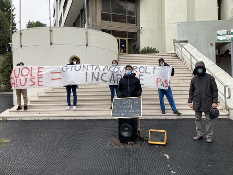 ANCONA- “Scuole chiuse=giunta Acquaroli incapace”. La scritta su uno striscione esposto durante un sit-in di protesta promosso stamattina davanti a Palazzo Raffaello, sede della Regione Marche ad Ancona, da docenti, famiglie e studenti aderenti al comitato “Priorità alla scuola”.