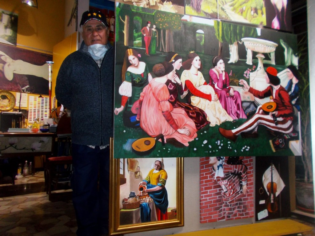 John William Waterhouse (Roma, 6 aprile 1849 – Londra, 10 febbraio 1917) è stato un pittore britannico appartenente alla corrente preraffaellita. “Un racconto dal Decamerone” è un’opera del 1916 considerata il suo capolavoro: un olio di 102 x 159 cm che si trova nella collezione Lady Lever Art Gallery di Liverpool. Una copia del dipinto, molto bella stilisticamente, è stata eseguita da Urbano Messina nel suo laboratorio di pittura in Via Varese, 15.