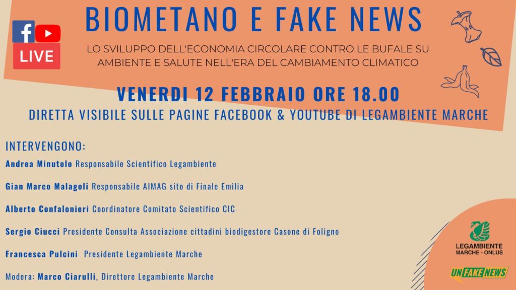 L’incontro si svolgerà domani, venerdì 12 febbraio, a partire dalle ore 18:00, in diretta facebook e youtube sulle pagine di Legambiente Marche. Prenderanno parte al dibattito, che sarà moderato da Marco Ciarulli, direttore di Legambiente Marche, Andrea Minutolo, responsabile scientifico nazionale di Legambiente; Gian Marco Malagoli, responsabile AIMAG sito di Finale Emilia; Alberto Confalonieri, Coordinatore Comitato Scientifico Consorzio Italiano Compostatori; Sergio Ciucci, Presidente Consulta Assocazione cittadini biodigestore Casone di Foligno; Francesca Pulcini, presidente di Legambiente Marche.