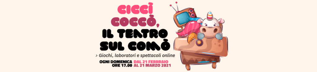Parte domenica 21 febbraio Ciccò coccò, il teatro sul comò, nuova rassegna online ricca di giochi, laboratori e spettacoli per passare un pomeriggio in famiglia. La organizza l’ATGTP Associazione Teatro Giovani Teatro Pirata insieme ad AMAT Associazione Marchigiana Attività Teatrali. Nel cartellone, spettacoli e attività laboratoriali online, con la visione di episodi video accompagnati da attività laboratoriali pensate ad hoc per la fascia di età dell’infanzia e le famiglie. Un’innovativa proposta che offre al pubblico di bambini e genitori un’occasione di intrattenimento e di gioco insieme, con tante proposte divertenti dove la partecipazione attiva della famiglia è indispensabile per la riuscita dell’attività.