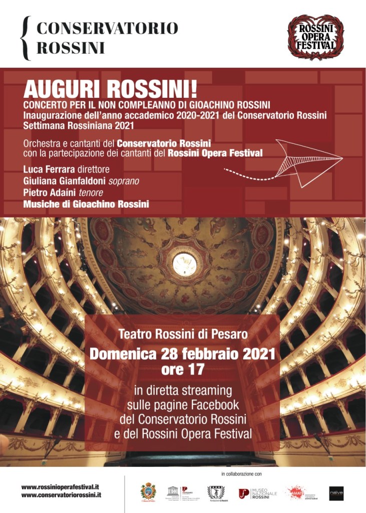 La Settimana Rossiniana si conclude domenica 28 febbraio – giorno ufficiale del Non Compleanno di Rossini – alle 17, dal Teatro Rossini, con ‘Auguri Rossini!’, il concerto lirico-sinfonico con cui il Conservatorio Statale di Musica G. Rossini partecipa ai festeggiamenti e inaugura l’anno accademico 2020-2021 di un’istituzione che esiste proprio grazie alla generosità del Maestro. L’evento si potrà seguireindiretta streaming sulle pagine Facebook del Conservatorio Rossini, del Rossini Opera Festival, del Comune e di Pesaro Cultura oltre che su Rossini TV (canale 633 del digitale terrestre). Sul palco del Rossini orchestra – diretta da Luca Ferrara – e cantanti del Conservatorio con la partecipazione dei cantanti del Rossini Opera Festival: Giuliana Gianfaldoni soprano e Pietro Adaíni tenore. Le musiche di Rossini sono tratte dalle opere: La Cenerentola, Guillaume Tell, Otello, La scala di seta, Tancredi, La donna del lago. L’evento è realizzato in collaborazione con: Comune di Pesaro, Fondazione Rossini, Museo Nazionale Rossini, Amat, Naive Studio.