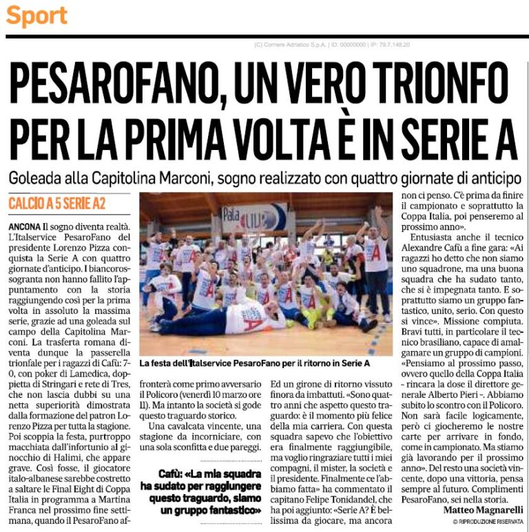 Oggi è il 4 marzo 2021. Sono passati appena 4 anni e siamo reduci da uno scudetto vinto, una Supercoppa Italiana in bacheca, due finali perse di misura – Coppa Italia e Coppa Divisione – e due partecipazioni in Uefa Futsal Champions League, da cui l’Italservice Pesaro è uscita in extremis contro due delle squadre più forti del mondo, dopo aver fatto emozionare centinaia di migliaia di appassionati di tutta Italia e non solo.