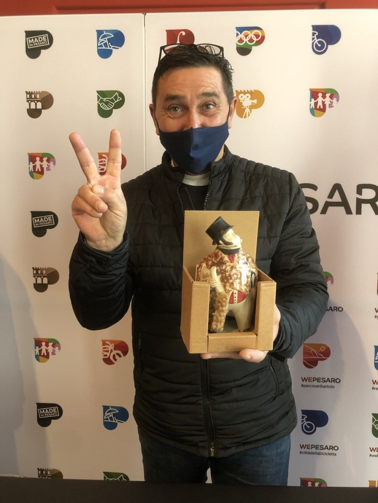 A consegnarla sono stati il vicesindaco e assessore alla Bellezza Daniele Vimini, il presidente del Consiglio comunale Marco Perugini, il responsabile dell’unità organizzativa Turismo di Pesaro Davide Venturi. «Partecipare al quiz, mettersi alla prova e vincere questo bel premio raffigurante il personaggio più illustre della città è stata una splendida esperienza. Appena sarà possibile tornerò in questi luoghi che ho imparato a conoscere in un modo estremamente divertente» ha concluso il terzo classificato.
