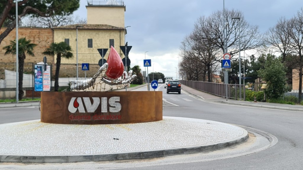 Con la scultura dedicata ai donatori di sangue, si completata la nuova rotatoria che regola la circolazione tra tra via Mameli, via Belvedere e via del Monaco. «Un’opera per omaggiare tutti i donatori di sangue – ha spiegato la presidente Avis Lina Rocca – perché rappresentano forza e speranza per la città. Una scultura realizzata e progettata attraverso un concorso di idee con l’Istituto d’Arte Mengaroni».