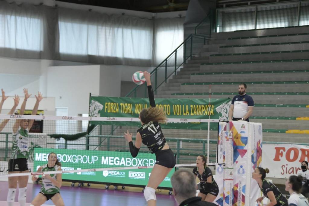 Nel secondo set si riparte testa a testa: un errore di Bacchi fa scappare Sassuolo (4-6), ma Pamio riaggancia subito. Due errori di Antropova e Dhimitriadhi portano avanti la Megabox (8-6) e Barbolini chiama time-out. Colzi e Pamio allungano (11-7), un ace di Balboni e due muri in fila di Costagli e Colzi siglano il +7 (15-8), per il nuovo time-out ospite. Antropova spara fuori il 16-8 (massimo vantaggio per le tigri). Salinas ricuce a -5 (12-17), poi sbaglia il servizio. Un muro su Bacchi fa riavvicinare le ospiti (18-14), Kramer è chirurgica sotto rete (19-14), ma ora Sassuolo ha ritrovato fiducia. Una magia di Balboni e un errore di Antropova ridanno fiato alle tigri (21-15), Salinas guadagna un mini-break (22-18), Pamio strappa cinque set-point: le murano il primo, Colzi getta fuori il secondo, chiude proprio Pamio dopo uno scambio combattutissimo (25-21).