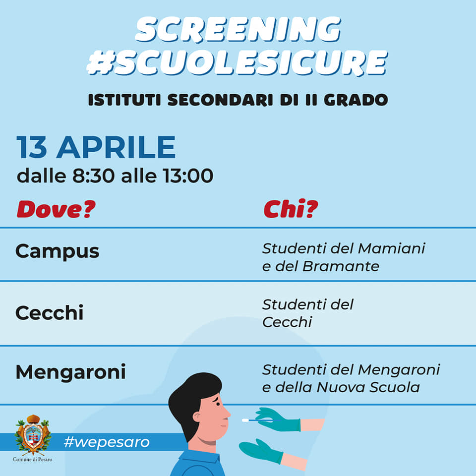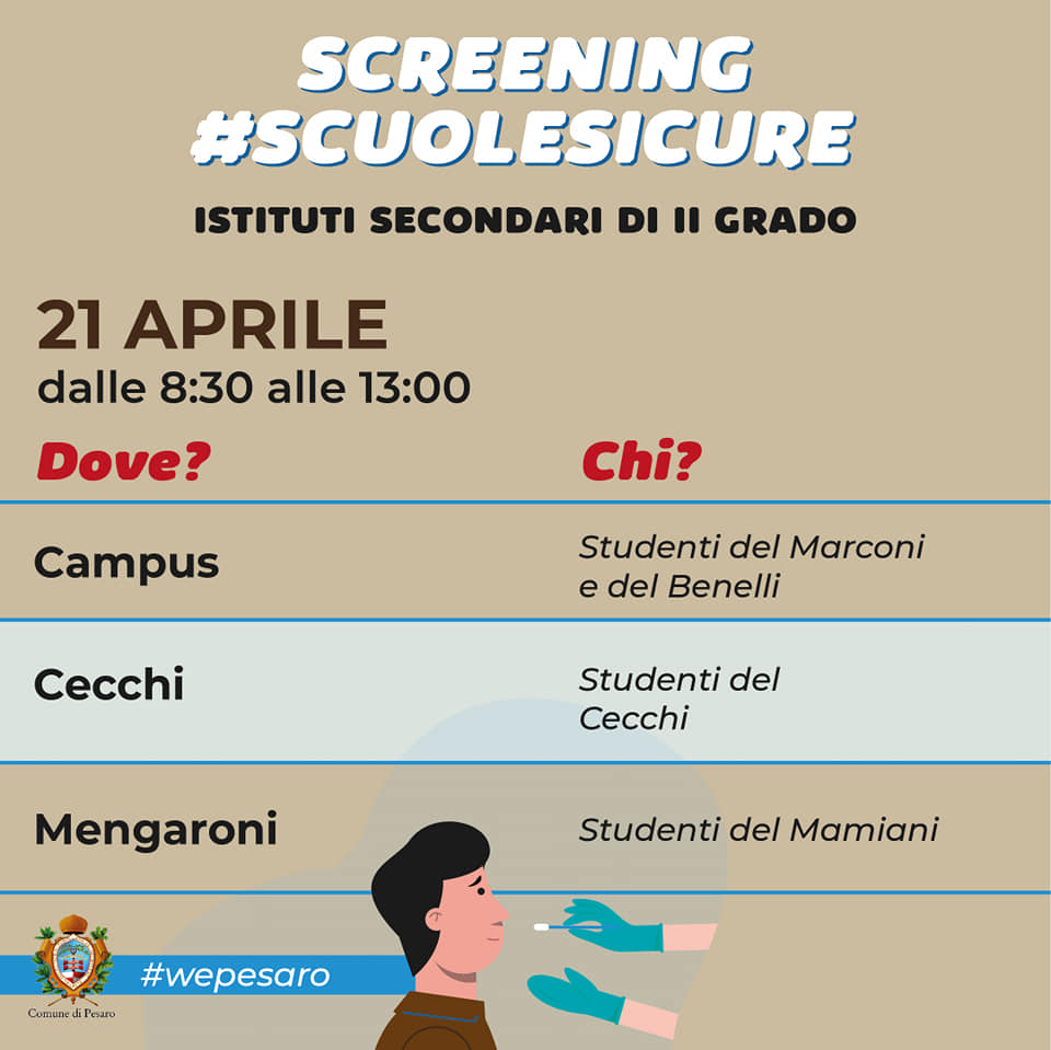 Dopo i tamponi rapidi agli studenti delle medie, domani riparte lo screening negli istituti superiori pesaresi. «Per la terza volta – spiega il sindaco Ricci, insieme all’assessore alla Coesione Della Dora e alla Crescita Ceccarelli – monitoriamo i ragazzi per garantire loro un ritorno in classe in sicurezza». Attualmente lo screening è l’unico modo per farlo e per garantire la conclusione dell’anno scolastico il più possibile in presenza, «perché – ricordano – i giovani fino a 16 anni sono fuori dalla campagna di vaccinazione e dai 17 anni in su lo faranno probabilmente in estate».