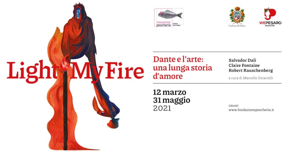 | Rimandata per il passaggio in zona rossa della città (avrebbe dovuto inaugurare il 12 marzo) e visibile finora solo dall’esterno, giovedì 29 aprile apre al pubblico ‘Light My Fire. Dante e l’arte: una lunga storia d’amore’, la mostra a cura di Marcello Smarrelli che rappresenta una delle iniziative cardine con cui Pesaro celebra i 700 anni dalla morte del Divino Poeta. La Pescheria diventa ‘luogo dantesco’ della città e accoglie due famose serie di incisioni realizzate da Salvador Dalì e Robert Rauschenberg per illustrare la Divina Commedia e una video installazione dell’artista Claire Fontaine. L’evento della Fondazione Pescheria-Centro Arti Visive è promosso in collaborazione con il Comune di Pesaro. Alla conferenza stampa, presente Daniele Vimini – vicesindaco e assessore alla Bellezza del Comune di Pesaro e, in collegamento, il curatore Marcello Smarrelli e Fulvia Carnevali per Claire Fontaine. Così Daniele Vimini: l’apertura di questa mostra in Pescheria ha un valore importante con una doppia valenza: segna simbolicamente – non a caso in anticipo di un giorno – la ripartenza della fruizione dei luoghi della cultura (dal 30 aprile riaprono i musei comunali e il Teatro Rossini con un concerto di jazz) e allo stesso tempo consente ad un’istituzione culturale davvero significativa per il territorio di portare il suo contributo alle celebrazioni nazionali per il 700esimo della morte di Dante. Anche se l’allestimento ha consentito la visione dei ‘contenuti’ del loggiato già dal 12 marzo, finora non è stato possibile realizzare i momenti performativi – maratone di lettura – che l’evento prevedeva; per questo abbiamo già in programma di svolgere in presenza i momenti di lettura a voce alta di cui si compone il progetto espositivo. Come accadranno in presenza nel prossimo periodo, magari anche in concomitanza con la Mostra Internazionale del Nuovo Cinema, eventi diversi di musica e poesia come l’Open Day del Conservatorio Rossini che avverrà proprio in questo spazio o performance di danza in collaborazione con Amat per far dialogare l’arte coreutica con Dante e la Divina Commedia. A proposito di Dante, padre della lingua italiana, ci auguriamo che questa esposizione possa magari essere visitata e offrire spunti alle scuole appena tornate in presenza, realtà particolarmente provate dall’emergenza che stiamo vivendo con quasi due anni scolastici di Dad.’ Il titolo della mostra prende spunto da una delle canzoni più famose dei Doors (1966) per sottolineare la capacità della poesia – quella dantesca più di ogni altra – di trascendere la realtà e condurci in una dimensione altra. Light My Fire rappresenta infatti uno dei primi e più eloquenti esempi di Psychedelic Rock, sviluppatosi in contemporanea negli Stati Uniti e Regno Unito fra gli anni sessanta e settanta: una tendenza musicale nata dalle esperienze di alterazione della coscienza derivanti dall’uso di sostanze psichedeliche. La Divina Commedia è un’opera a carattere teologico-morale-enciclopedico, non è fantasy, non è horror e tanto meno fantascienza; questo si dice di solito ma forse non è esattamente così, perché in Dante sono presenti elementi riconducibili un po’ a tutti i generiletterari con le loro varianti. Non è un caso che la Divina Commedia venga citata in ben cinque punti della produzione di Philip K. Dick. La grandissima diffusione e l’interesse che da secoli accompagnano la Divina Commedia sono dovuti, oltre che al valore letterario assoluto, anche alle illustrazioni nate fin da subito per quelle rime. Dai primi sconosciuti miniatori ai più grandi artisti del ‘900 fino ai contemporanei, moltissimi si sono cimentati con il testo dantesco, dando forma a suggestioni profonde con cui ricreare visivamente l’incredibile mondo ultraterreno ideato da Dante. Ecco allora che nello spazio della chiesa del Suffragio sono allestite scenograficamente le 100 tavole ad acquarello di Dalì che fondono simboli, magie e allegorie, richiamando i vari aspetti della sua ricerca stilistica, dall’estetica del molle ai miti classici al metodo pittorico paranoico-critico fino alla surrealtà, alla dimensione onirica alle prospettive irrazionali. Dalì ci lavora per nove anni e le tavole, esposte nel 1960 al Museo Galliera di Parigi, vengono poi tradotte in xilografie: lontanissime dalle interpretazioni conosciute del testo dantesco, hanno una fascinazione unica. Ad offrire un’esperienza completa di sensi, le incisioni sono accompagnate dal sound piece “Dalla selva oscura all’amor che muove il sole e l’altre stelle’: le più famose terzine della Commedia“, a cura dell’associazione culturale APS ‘Le Voci dei Libri’; lettori: Marilena Alessi, Corrado Capparelli, Cristian Della Chiara, Giuseppe Esposto, Lucia Ferrati, Elisabetta Liz Marsigli, Silvia Melini, Luca Sinelli; tracce musicali: Luca Marzi, Paolo Marzocchi; recording e produzione, Tobe Stubio.. Nel loggiato, invece, l’interpretazione ancora più personale e innovativa dell’Inferno di Robert Rauschenberg precursore della Pop Art: 34 incisioni eliografiche, ricche di riferimenti alla società del secondo novecento americano. Per queste tavole Rauschenberg usa la tecnica del Transfer Drawing, trasferendo sul foglio immagini fotografiche da giornali e riviste e intervenendo poi con matite, tempere e inchiostri; un lavoro complesso che lo impegna per due anni e viene presentato per la prima volta nel 1960 alla Galleria Leo Castelli di New York. Ancora nel loggiato, su un maxischermo, è visibile tutti i giorni dalle 19 alle 23, la documentazione video di una performance iconica dell’artista collettiva ready made Claire Fontaine, intitolata P.I.G.S. acronimo che unisce i paesi dell’Europa più indebitata: Portogallo, Italia, Grecia e Spagna. L’opera (2011) è composta da centinaia di fiammiferi piantati in fori praticati manualmente sul muro e poi bruciati; l’incendio metaforico di 