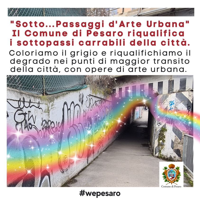 Dare colore agli spazi grigi della città. Questo lo scopo del progetto “Sotto…passaggi di arte urbana”, pensato dal Comune di Pesaro per «promuovere un intervento di miglioramento estetico – spiegano il sindaco Matteo Ricci e l’assessore all’Operatività Enzo Belloni – dei sottopassi cittadini, tramite la realizzazione di murales». Un progetto di riqualificazione «che riguarda alcune delle aree più critiche di ogni centro urbano, zone che si prestano più facilmente al degrado». Un’idea del coordinatore eventi del Comune di Pesaro Massimiliano Santini: «Per Pesaro un’idea che potrebbe regalare un’immagine diversa alla città, pulita, ordinata, colorata, a beneficio di cittadini, turisti e visitatori».