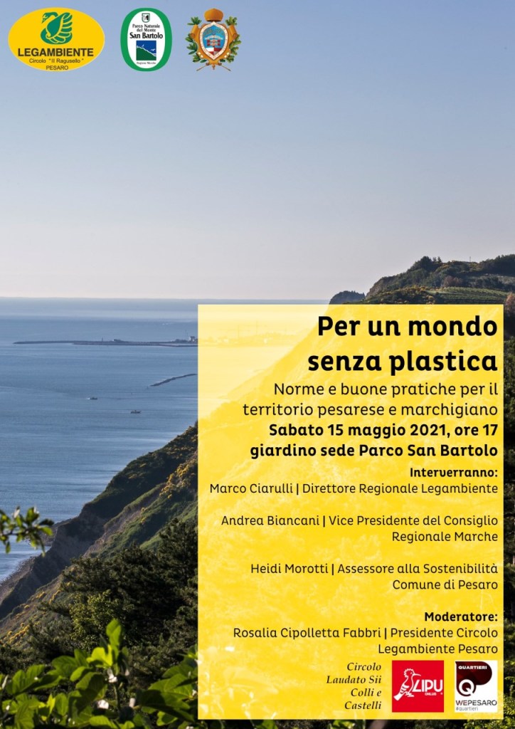 Si chiama “Per un mondo senza plastica. Norme e buone pratiche per il territorio pesarese e marchigiano” l’appuntamento organizzato da Legambiente “Il Ragusello” di Pesaro, con il patrocinio del Comune di Pesaro e Parco San Bartolo, in collaborazione con il Quartiere 9, Lipu Pesaro e Circolo Laudato Si’ Colli e Castelli in programma domani, sabato 15 maggio, alle ore 17, nel giardino della sede dell’ente, in viale Varsavia, zona Baia Flaminia.