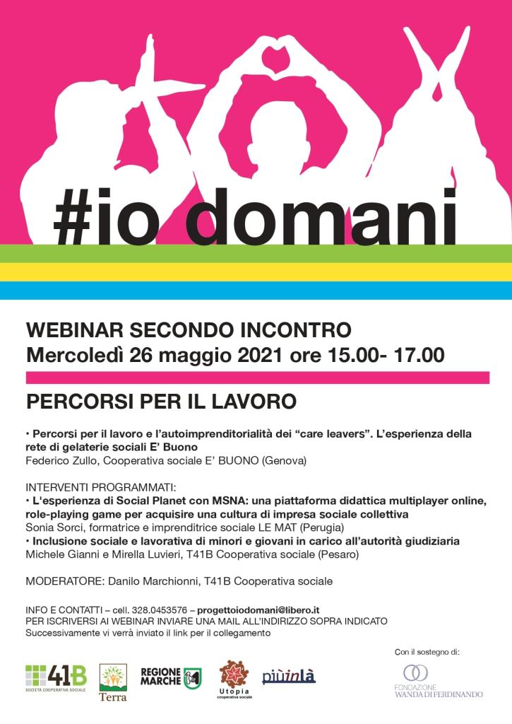 PESARO – Continuano i webinar del progetto #IODOMANI per raccontare come favorire l’autonomia abitativa, lavorativa e relazionale di minori che escono dal sistema di protezione e privi di reti familiari e di sostegno. Nell’incontro on line di mercoledì 26 maggio 2021 alle ore 15.00 saranno presentate azioni concrete, iniziative e buone prassi legate a “Percorsi verso l’autonomia lavorativa” di alcune realtà di Genova, Perugia e Pesaro.
