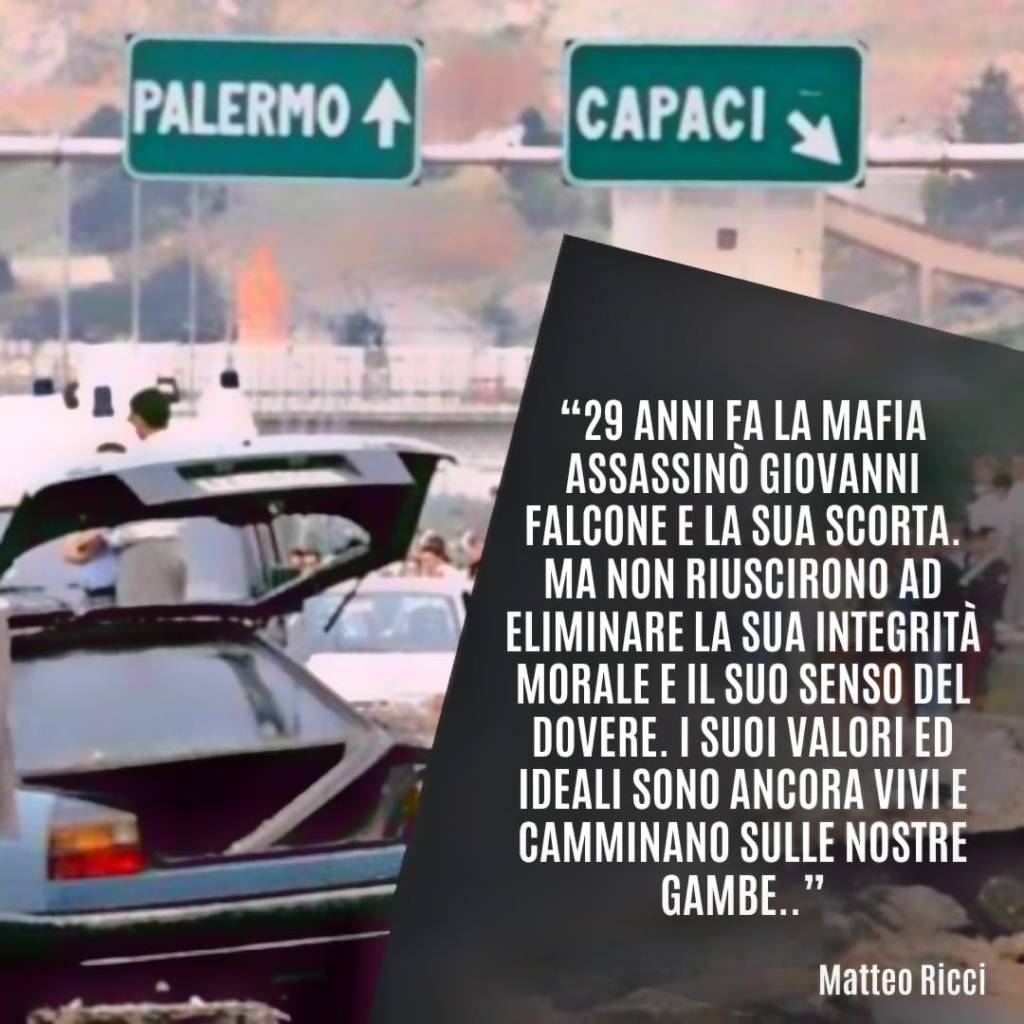 Ventinove anni fa la strage di Capaci, dove perse la vita il magistrato Giovanni Falcone, insieme alla moglie Francesca Morvillo e alla scorta. Il ricordo del sindaco Matteo Ricci: «29 anni fa la mafia assassinò Falcone, la moglie Francesca Morvillo e la sua scorta. Ma non riuscirono ad eliminare la sua integrità morale, il suo senso del dovere. I suoi valori ed ideali sono ancora vivi e camminano sulle nostre gambe».