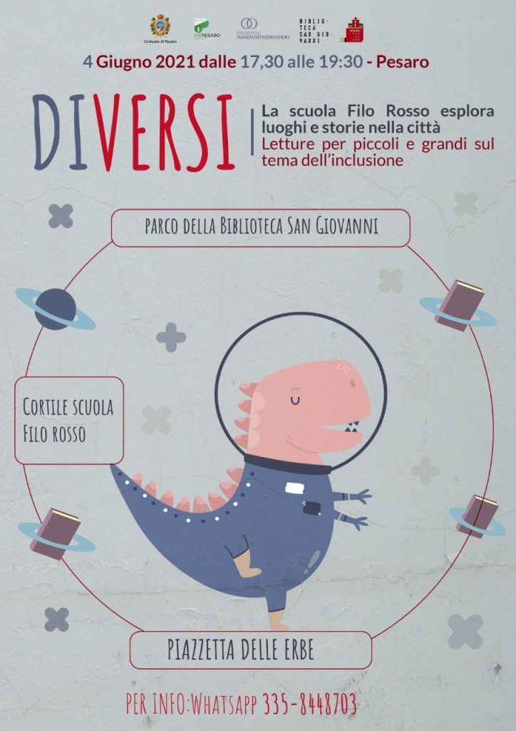 Si chiama “DiVersi” l’iniziativa promossa dalla scuola comunale per l’infanzia Filo Rosso che prevede “Letture per piccoli e grandi sul tema dell’inclusione”. L’appuntamento è in programma venerdì 4 giugno, dalle 17:30 alle 19:30, in contemporanea in tre spazi aperti del centro storico: il cortile della scuola Filo Rosso (via delle Galigarie) il giardino della Biblioteca San Giovanni (via Passeri 102) e la piazzetta del San Domenico “Mercato delle Erbe” (via Branca).