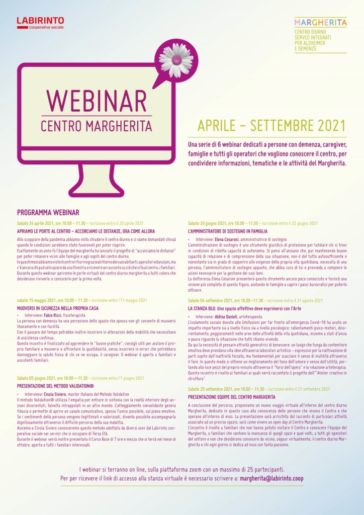 Durante la serie di webinar che termineranno a settembre, verranno sviluppati argomenti utili per trattare la persona con demenza attraverso consigli e indicazioni di fisioterapisti, operatrici Validation®, arteterapeuti, amministratori di sostegno. Nei webinar saranno presentati gli ambienti del centro diurno Margherita di Fano, l’équipe e le attività svolte negli spazi del centro. Il programma completo è disponibile su: labirinto.coop/centro-margherita/webinar/.