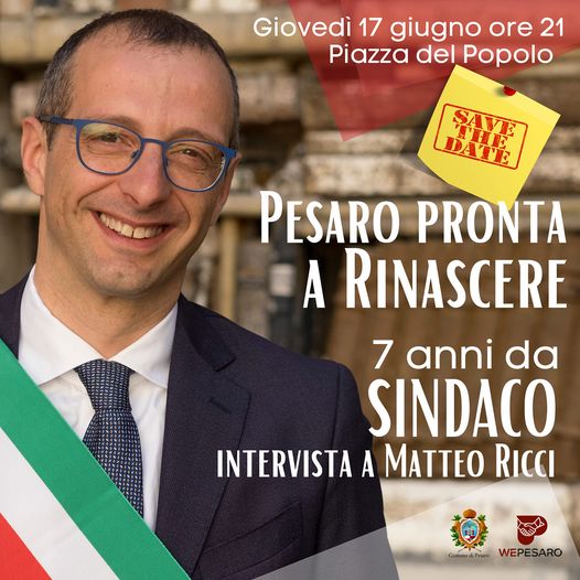 Segnatevi questa data in agenda. Giovedì 17 giugno, ore 21 in piazza del Popolo, Matteo Ricci farà il punto sui suoi sette anni da sindaco. “Pesaro pronta a rinascere”, questo il nome dell’evento, «che – spiega il sindaco Ricci – sarà l’occasione per parlare di futuro e di come la nostra bella città è pronta a ripartire». Per prenotare un posto, inviare una mail a sindaco@comune.pesaro.pu.it oppure chiamare il numero: 0721387242.