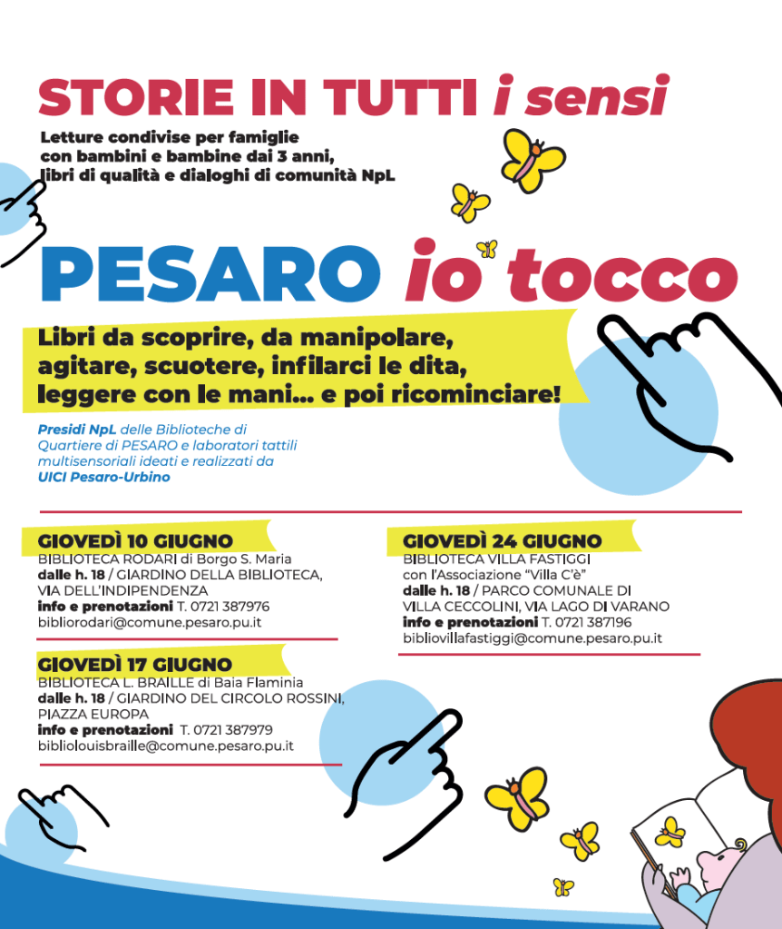 La lettura come strumento di civiltà e le biblioteche luoghi di inclusione di una comunità. Dal 10 giugno le Biblioteche di Quartiere di Pesaro partecipano all’iniziativa regionale ‘STORIE IN TUTTI i sensi’, primo ciclo di incontri in programma nei capoluoghi di provincia marchigiani promosso dall’Unione Italiana Ciechi e Ipovedenti (UICI) delle Marche e dai Presìdi Nati per Leggere e Nati per la Musica/Marche.