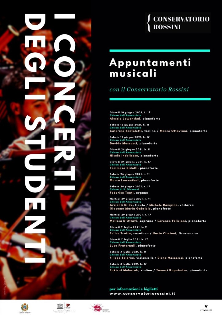 Primi appuntamenti della rassegna: giovedì 10 giugno con il recital pianistico di Alessio Lowenthal (Chiesa dell’Annunziata, ore 17); a seguire doppio appuntamento sabato 12 giugno alla Chiesa dell’Annunziata con il duo violino e pianoforte formato da Caterina Bartoletti e Marco Ottaviani (ore 11) e il concerto pianistico di Davide Massacci (ore 17). I concerti presso la Chiesa dell’Annunziata prevedono l’ingresso con biglietto di cortesia di € 5,00 acquistabile presso il luogo dell’evento a partire da un’ora prima del concerto o in prevendita online su vivaticket. Per informazioni http://www.conservatoriorossini.it