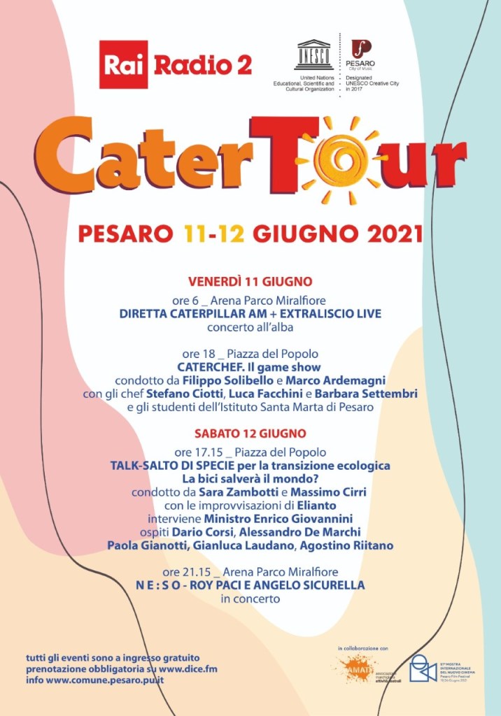 Ultime ore per prenotare i biglietti del CaterTour, che da domani arriva in città con il nuovo format dello storico Caterraduno e con i suoi eventi “dall’alba al tramonto”, in programma venerdì 11 e sabato 12 giugno. Protagonisti saranno gli “storici” conduttori dei programmi Caterpillar e Caterpillar AM di Rai Radio2, chef stellari, ultraciclisti e il ministro Enrico Giovannini.