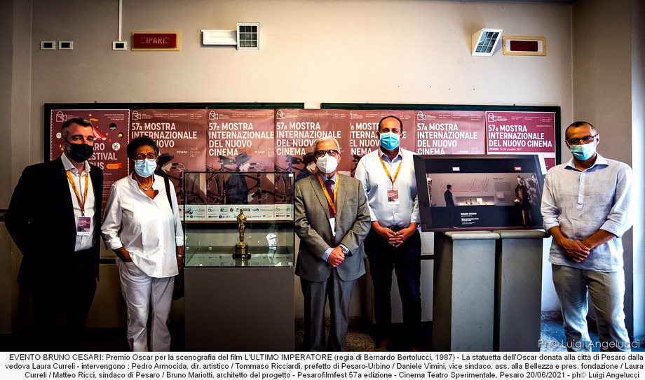 Domenica, invece, è stato molto seguito l’evento in ricordo dello scenografo pesarese Bruno Cesari, durante il quale il pubblico ha avuto la rara opportunità di vedere da vicino la mitica statuetta del premio Oscar, vinto da Cesari per L’ultimo Imperatore e donata alla città dalla vedova dell’artista Laura Curreli. Si è trattato di una cerimonia emozionante, alla quale ha partecipato anche il prefetto Tommaso Ricciardi che ha definito la Mostra un “tempio del cinema”, ringraziando la famiglia per il nobile gesto che arricchisce ulteriormente l’eredità cinematografica della città. Anche il sindaco Matteo Ricci ha voluto esprimere l’enorme senso di gratitudine che Pesaro nutre nei confronti della famiglia di Cesari per il dono fatto che andrà ad impreziosire un luogo storico come il Teatro Sperimentale. Per l’occasione, è stato anche presentato il progetto della teca che verrà installata proprio all’entrata del Teatro Sperimentale contenente tutti i premi donati dalla famiglia dello scenografo.