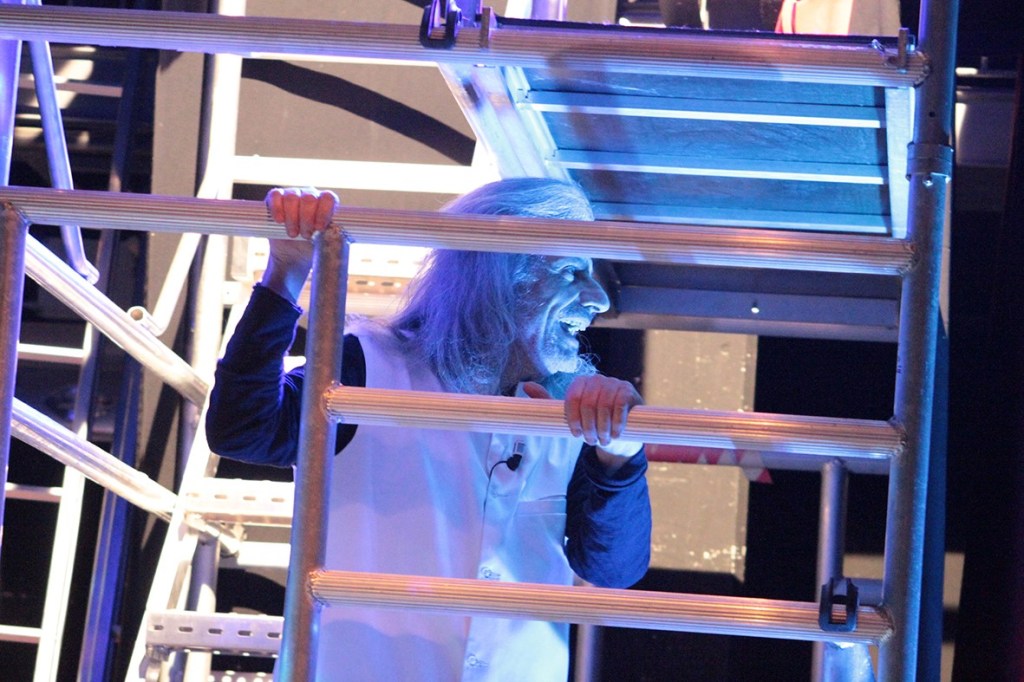 Trascendi e sali è il titolo dello spettacolo presentato a Pesaro, quindicesimo allestimento dell’artista che arriva dopo Urge e Nessi, spettacoli che hanno portato la sua ricerca, non solo teatrale ma di artista totale, in territori fino ad allora solo sfiorati. La peculiare comicità unita all’indignazione morale, prima che civica o politica, ha subito sicuramente una svolta netta e decisa che sta per approdare ad un nuovo capitolo. Ma se è vero che i comici, o i poeti, si riconoscono dalla propria ombra, quella di Alessandro Bergonzoni è netta, stagliata, riconoscibile e di assoluta qualità.