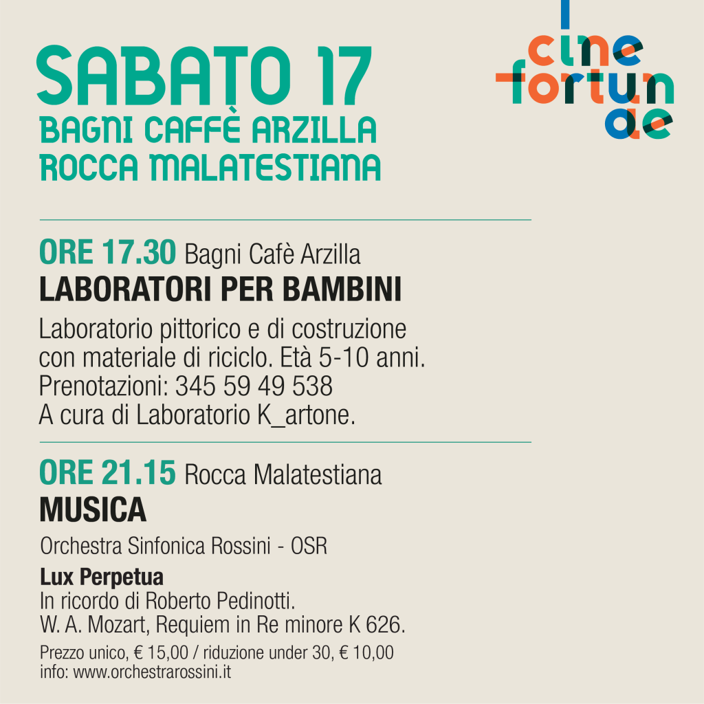Alle 21.30 il Main Stage della Rocca Malatestiana ospita l’Orchestra Sinfonica Rossini, con Lux Perpetua, in ricordo di Roberto Pedinotti; in programma il Requiem in Re minore K 626 di Mozart.