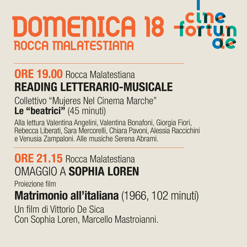 Due concerti, un reading letterario-musicale, un laboratorio per i più piccoli e la proiezione di un capolavoro del grande schermo nella programmazione di sabato 17 e domenica 18 luglio. L’omaggio al cinema al femminile punta su un’altra grande diva, Sophia Loren, e continua con una performance del collettivo “Mujeres nel Cinema Marche”.